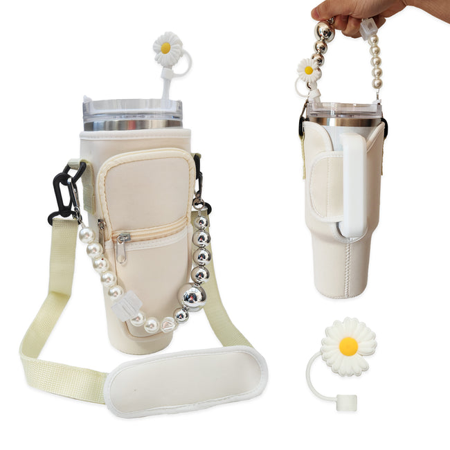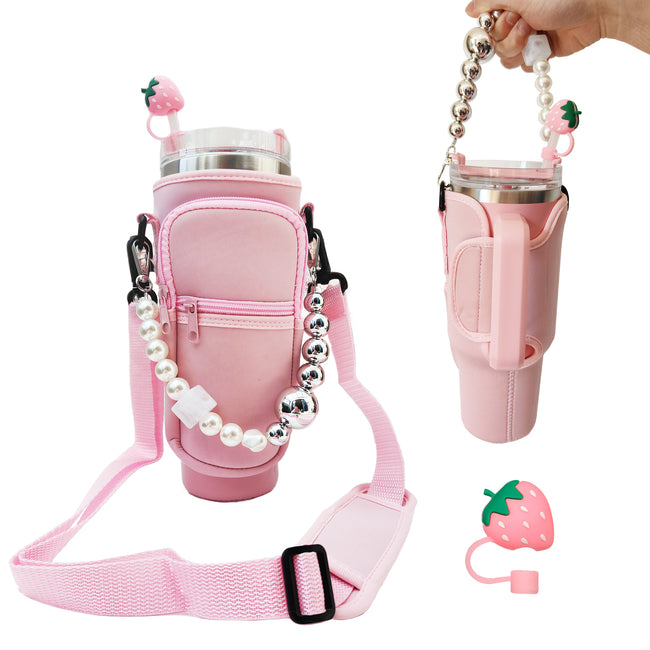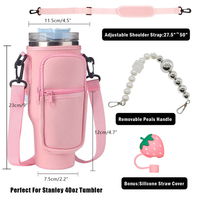 Water Bottle Carrier Bag with 2 Cup Sling 1 Straw Cover for 40oz Stanley Crossbody Holder, Water Bottle Holder Pocket Tumbler Carrier with Strap for Stanley Cup Accessories