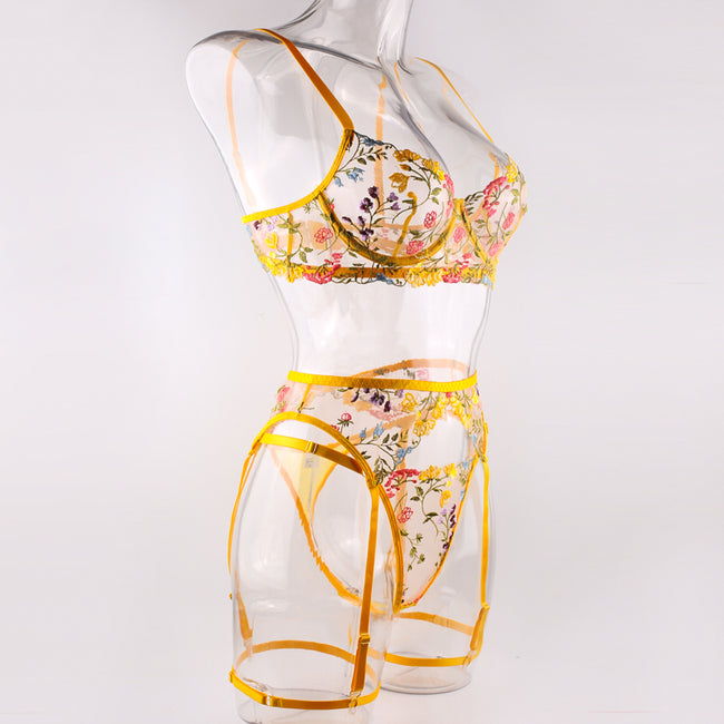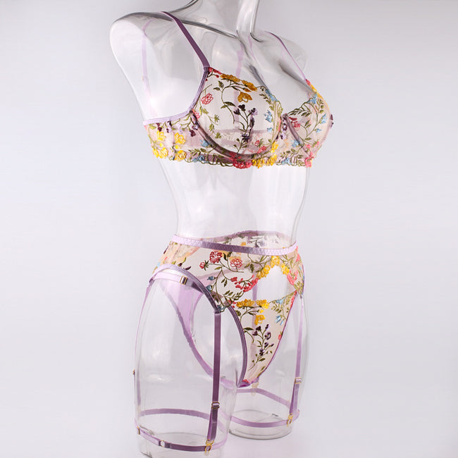 3-Piece Sensual Floral Lace Transparent Lingerie Embroidery Kits Intimate