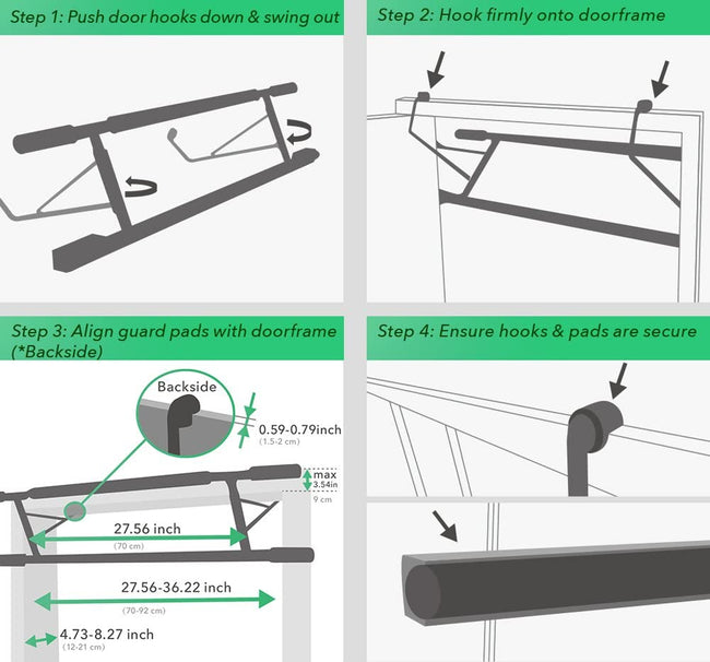 Maximale Stabilität, robuste, hochwertige Konstruktion. Robustes Design verhindert Bewegung der Stange während des Trainings. Sicheres Gewichtslimit von bis zu 200 kg. Gepolsterte Polster verhindern Schäden am Türrahmen.